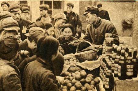 石景山发电厂合作社春节时给职工们准备了七千余万元(旧币)人民币的年货。合作社的工作人员热心为大家服务,发电厂的工人和家属们纷纷到这里来购买自己需要的物品。
