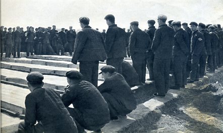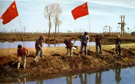 指挥部成员深入生产第一线领导生产。这是主任汪洪贵(右起第二人)和副主任、县委书记张满(左前第一人)等和社员一起劳动。