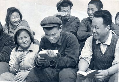 怀柔县抓革命促生产第一线指挥部以毛泽东思想指挥春耕生产。图为指挥部成员定期学习毛主席著作。