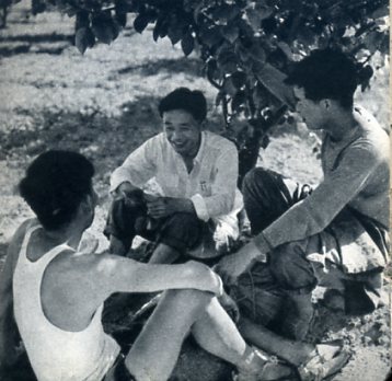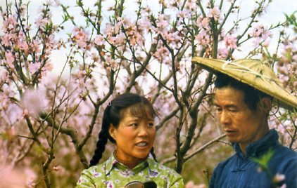 果园是大队的一项新兴事业。这是果树专业队队长林孝道(右)和社员一同观察水蜜桃。