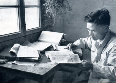 林鸿达经过几年来的农业生产实践,正在撰写关于合理轮作等问题的科学报告。