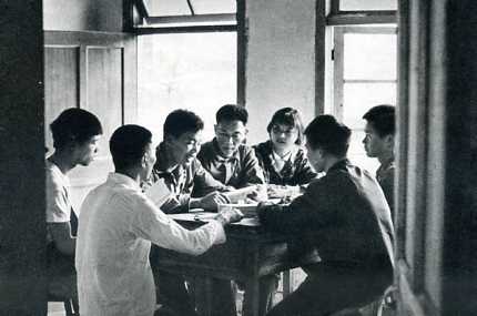 知识青年同贫下中农一起学习马列著作和毛主席著作。