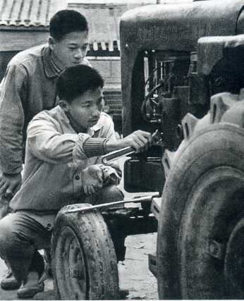 东游公社农业机械站的知识青年林涛在修拖拉机。