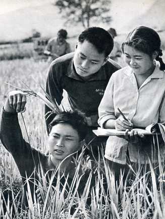 东游公社良种场科研小组的知识青年在田间进行杂交水稻考种。