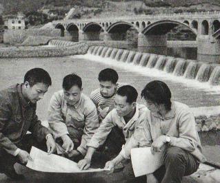 知识青年和贫下中农、技术人员一起,在水利工地上。