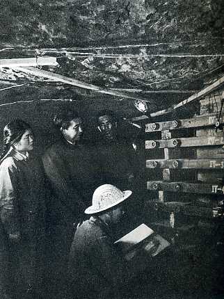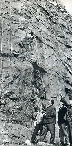 陈宗基和科技人员在现场研究由于爆破而引起的岩层错动现象。