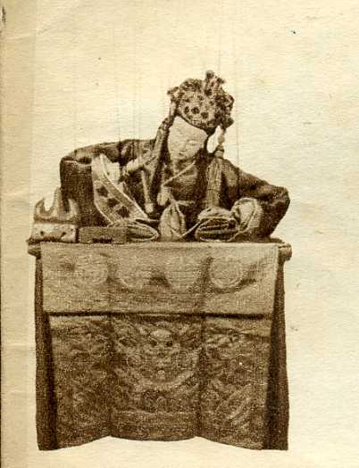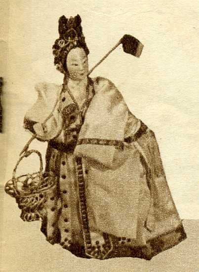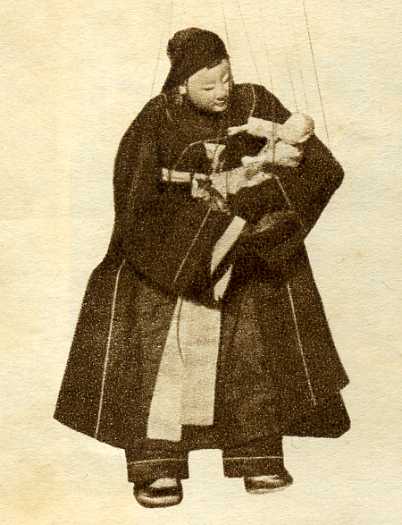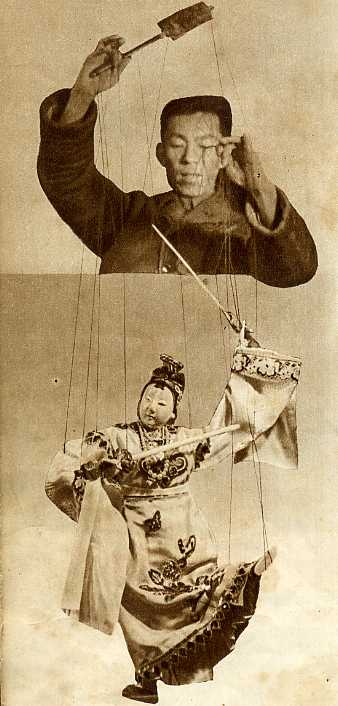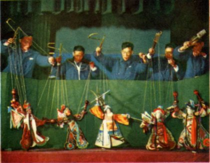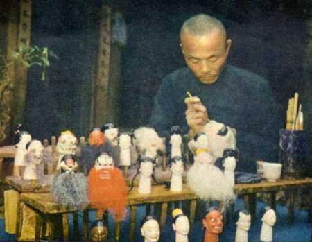 木偶的形象、服装的设计雕刻,都是由专门的艺术人担任的。这位艺人正在描绘一个新戏里的木偶。