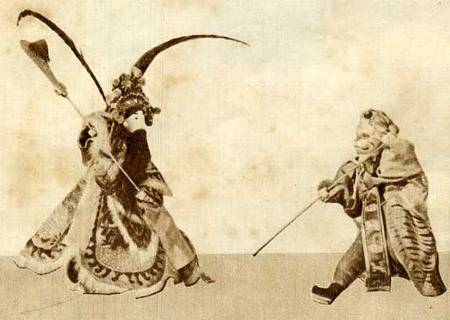 神话剧“西游记”之一幕。猴精孙悟空冲进天宫,大战守卫的神将。