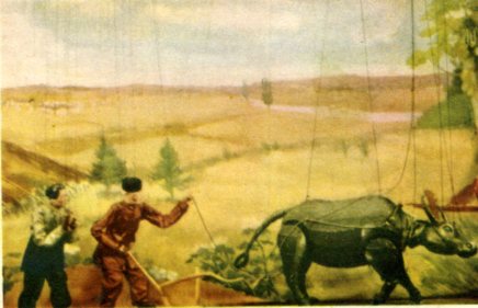 福建省泉州市木偶实验团演出的童话剧中老婆婆和老公公耕田的场面。
