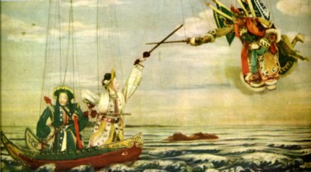 “水漫金山”中白娘子(中)和小青(左)到金山寺向法海和尚(右)索还丈夫。