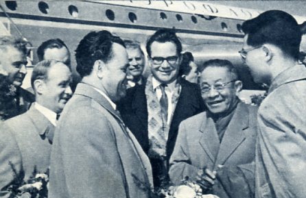 前来商讨中苏两国1962年贸易经济问题的苏联贸易经济代表团,由团长、苏联对外贸易部部长帕托利切夫(左二)和副团长、苏联国家对外经济联络员委员会副主席苏洛耶夫(左一)率领,4月13日到达北京。图为代表团在机场受到我国对外贸易部部长叶季壮的热烈欢迎。