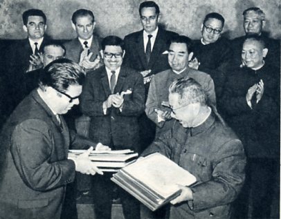 “中华人民共和国政府和古巴共和国政府一九六三年贸易议定书”、“中华人民共和国政府和古巴共和国政府关于中华人民共和国给予古巴共和国贷款的协定”、“中华人民共和国共和国和古巴共和国对外贸易机构交货共同条件议定书”,二月二十二日在北京签字。图为我国对外贸易部长叶季壮和古巴对外贸易部长阿耳贝托•莫拉(左)分别代表两国政府在上述议定书等三个文件上签字后交换文本。