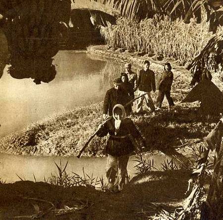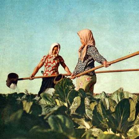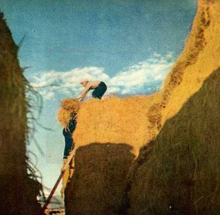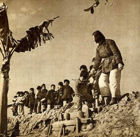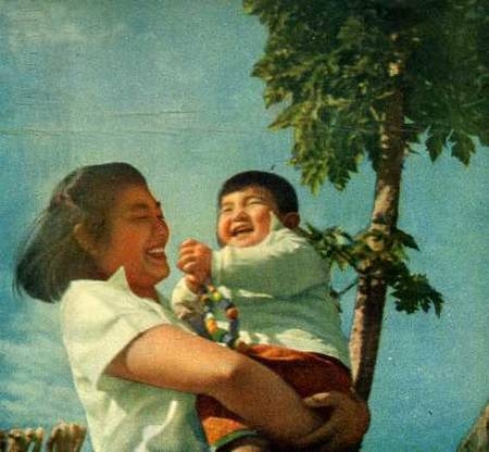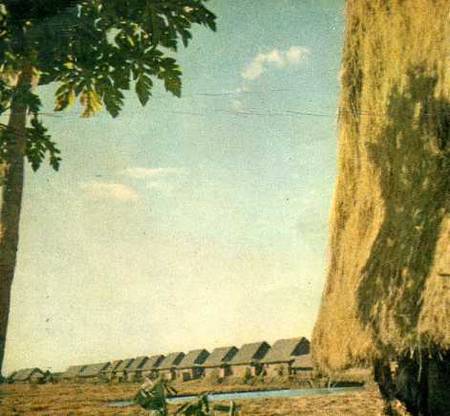 农场托儿所的保育员领着一个个小的腰鼓队,到田间去表演。
