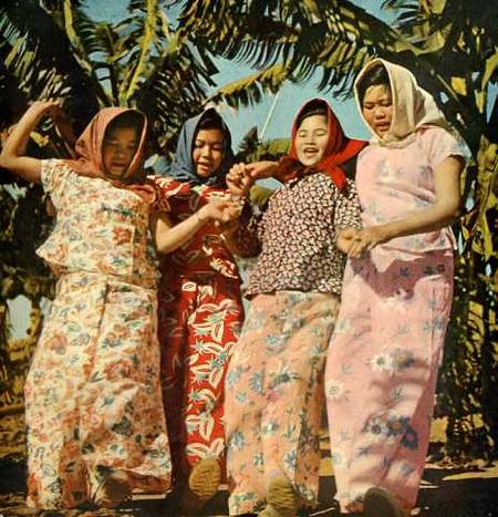 年青的女场员们聚集在香蕉树旁,跳着刚刚学会的“集体舞”。