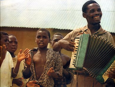 青年们高唱革命歌曲:“起来,刚果青年,……让我们为国家工作,让我们团结起来,卷起袖子来,为未来而工作……”