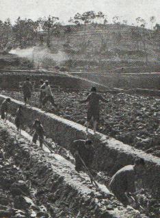 “下雨一团糟,晒干象把刀,洪来一片白,锈水满田铺。”这是龙川县铁场公社铁场大队红旗生产队阿婆麻坑昔日的写照。从1972年冬起,红旗生产队的干部和社员,学大寨改天换地。图为阿婆坑的全景。(1975年)