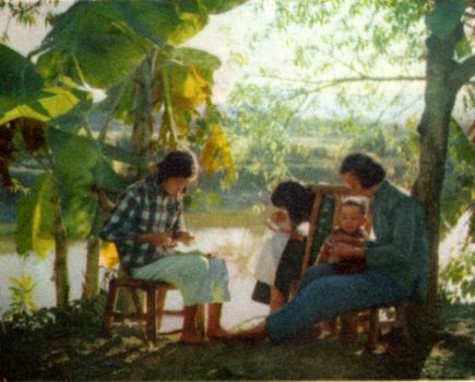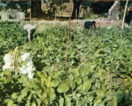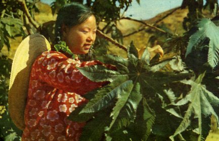 山上建立了一个养蚕场。这是饲养员伍宝琼在采集箆麻叶。