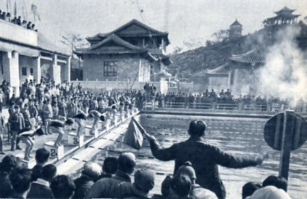 正当我国吉林省举行滑雪比赛的时候,广东省却展开了露天游泳运动。这是在新会县举行的广东冬季游泳运动大会,参加比赛的有25个县的390名运动员。(1959年)