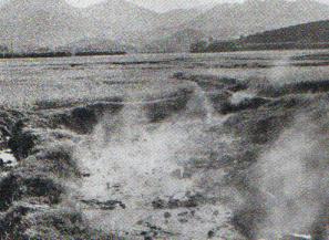 丰顺县有地下热水五十九处之多,被称为“热水之乡”。从丰良南行,至汤坑、新楼一带,到处都可以看见一泓泓热气蒸腾的温泉。这些温泉,水温高达摄氏86至104度。图为热气蒸腾的温泉。(1975年)