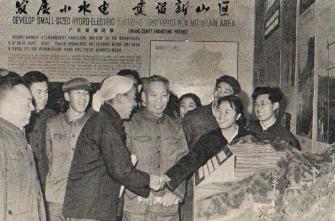 陈永贵在中国出口商品交易会大楼,参观佛冈县洛洞大队发展小水电、建设新山区的模型。(1973年)