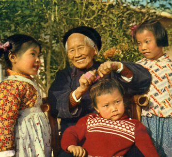 彭湃烈士的母亲,现年九十岁。这是她和重孙女儿们在一起。