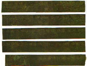 新莽 铜丈。全长230.3厘米,现藏台北故宫博物馆。这批新莽时代的衡器有一段聚散离合的沧桑史话:民国十六年(1927年)夏天,定西县称钩驿因大雨冲坏了山原,冒出了一组铜器窑藏,共有八件:计衡一,钩一,丈一,权五,皆为新莽时的衡器。