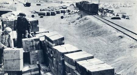 兰(州)新(疆)铁路不断地从兰州向西修筑,火车已经通到接近新疆的峡东车站。运往新疆、青海和西藏的物资在这里卸车后,再用汽车转运。(1958年)