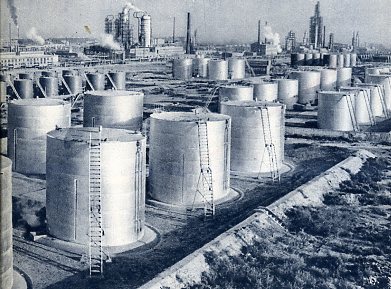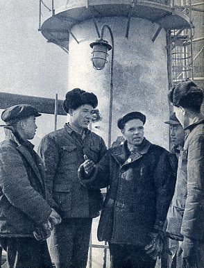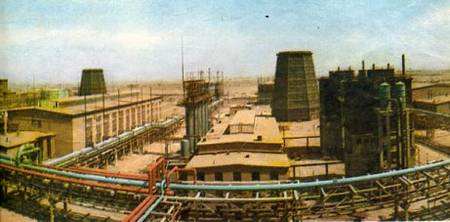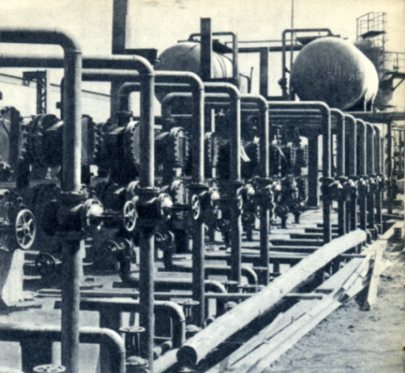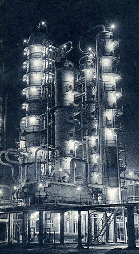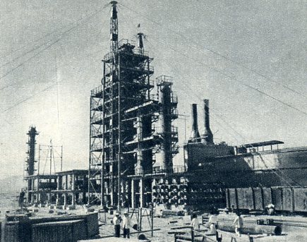 兰州西郊,黄河右岸,出现了一群群银色的油罐,一组组耸入天空的炼油塔。它们像巨人一样俯视着滚滚的黄河。这就是高度自动化的兰州炼油厂,工人们坐在仪表面前就能掌握炼油的整个生产过程。它是在苏联的无私帮助下建设起来的。玉门、克拉玛依和柴达木的原油将运到这里加工。