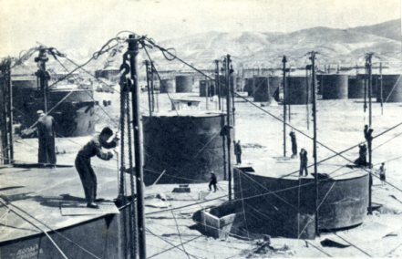 扩建工程又开始施工了,工人们在焊制巨大的油塔壳。