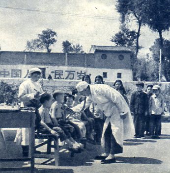 各个公社都成立了卫生所,加强卫生保健工作,许多村庄已消灭了各种传染病。这是大柳树村卫生所的医生在给小学生们作定期身体检查。
