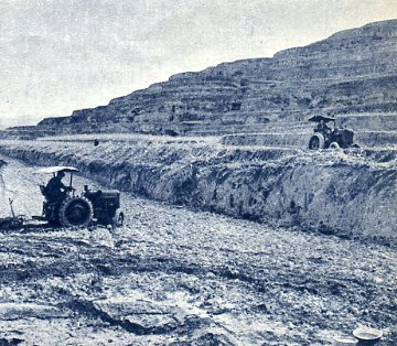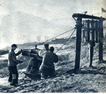 自动倒土的三轮运土车,两部一组,用绳索相连,重车顺坡而下时空空车就顺坡而上,有如飞龙。