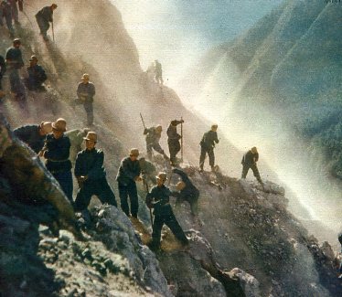 引洮工程中最艰险的一段,民工们在这里大战顽石,工效从开工初期的每人每天两公方提高到30公方左右。