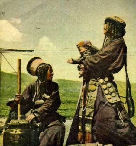 天祝自治区的牧民拉本爽的妻子达照吉抱着幼孩看拉本爽的妹妹宽照吉在篷帐前捣酥油。