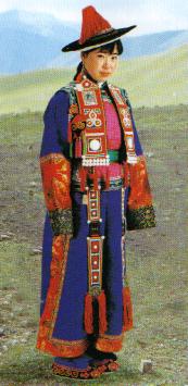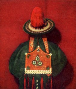 裕固族妇女服饰。裕固族世代从事畜牧业,游牧于戈壁草滩,其服饰具有游牧民族特色。女子穿大襟长袍,衣领高至耳根。袍子用绿、蓝色布料制作,下摆开衩,袖口、领襟、袍侧都饰有很宽的花边。腰系绸布长带,带端垂于身后。戴“红缨帽”。女帽的样式因地区不同而有所区别。明花地区的帽筒呈锥形,康乐地区的帽筒呈直筒形。“头面”和辫套使裕固族女子的服饰与众不同。