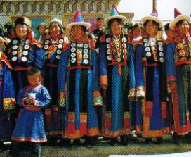 裕固族女子服饰。该裕固族女子服饰极为华丽。长袍外套穿鲜艳的彩缎高领坎肩,两条“头面”垂至下摆处。