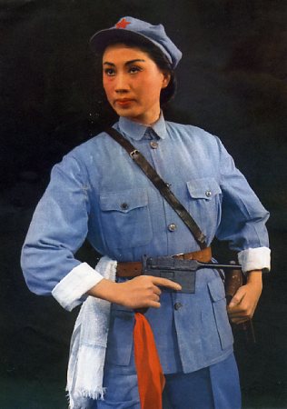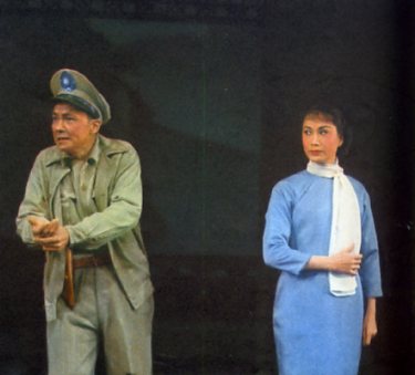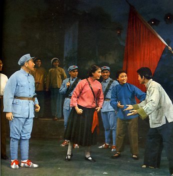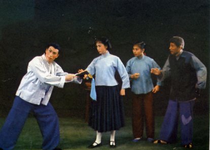 反动堡主刘立人的护兵黑牛(左一)出身贫苦,经过了刘琴(左二)和何奉父女的帮助,认识到刘立人就是贫苦农民的敌人,表示坚决服从刘琴指挥。
