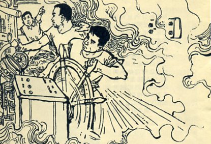 驾驶台前,子弹横飞,火光闪闪。指导船长陈大瑛,坚定沉着,不断发出改换行驶方向的舵令。二副林荣飞地转动舵轮。船长黄不三敏捷地操纵车钟,通知机轮加快车速。