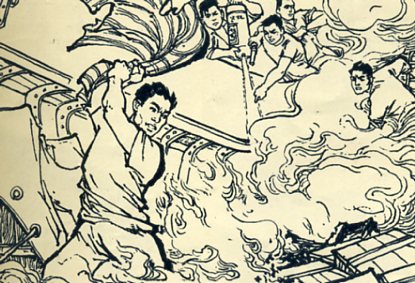 船身严重倾斜,但是船员的红心是炸不毁的。政委陈永尚下令离船时,他们集合在甲板上,悲愤地在牺牲的烈士前宣誓:踏着烈士的血迹前进,迎接新的战斗!