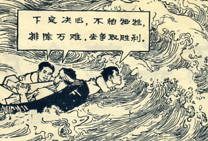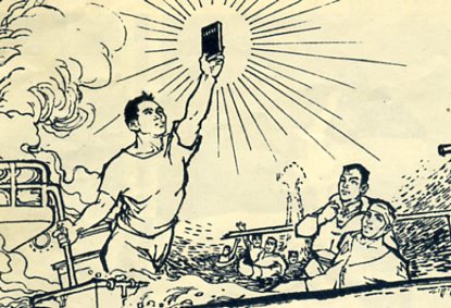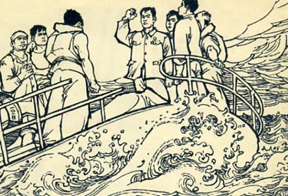 敌机下在扫射,全船可能迅即下沉。这时,同志们镇定如常,团结如钢,互相帮助穿好救生衣,有组织地下海。报务员黄伟超拿着红光闪闪的《毛主席语录》从报房里冲出来,宝书的万丈光芒,照亮了英雄们前进的道路。
