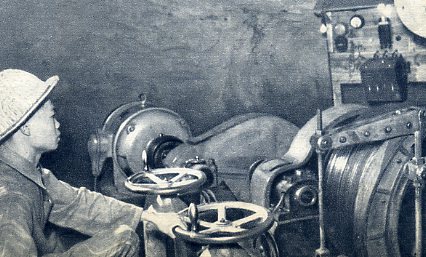 自治区内新建现代化厂矿有107个。这是大厂锡矿的卷扬机操作室。