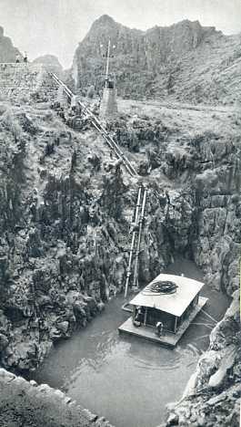 用安装在水泥船上的抽水机扬水上山,灌溉田地。