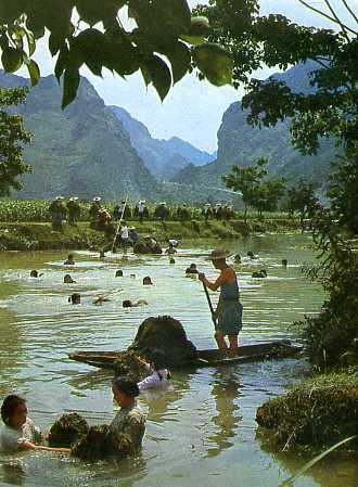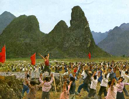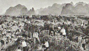 都安瑶族自治县位于桂西大石山区,境内石山林立,是个有名的“九分石头一分土”的穷山区。图为都安各族人民在战石海,造平原。(摘自《民族画报》1979年第1期)