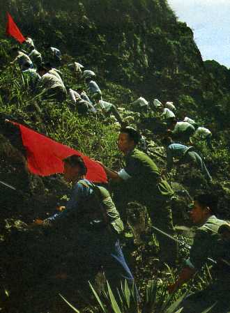 体育运动与民兵训练相结合。这是五竹大队的社员在进行爬山活动。