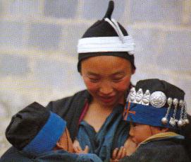 白裤瑶母子服饰。左为女孩,右为男孩。按当地习俗,男孩的小帽上饰有银罗汉、银帽花、银响铃等物,意为辟邪。