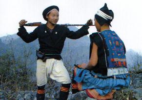 白裤瑶男女服饰。南丹县白裤瑶男子身穿青布对襟衣,下着白布灯笼裤,宽臀紧腿,款式奇特。女子穿贯头式无袖衣,衣背饰有一该族标志的方盘王印,下着百褶绣花裙。