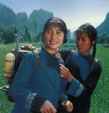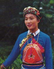 仫佬族女子服饰。仫佬族服饰尚青黑色。青衣青裤,青布包头均是自己染织制作。女子服装款式为左衽大襟上衣,中式长裤。年轻女子的衣襟饰有很宽的花边,系绣花围腰,穿绣花鞋,喜佩各种银饰。