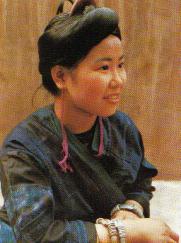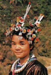 融水县男子盛装头饰。花瑶男子的包头样式很别致。他们将长长的青布帕缠绕在头上呈高筒状,盛装时插饰羽毛和银饰。短发露在包头外面,分别垂至眼角。