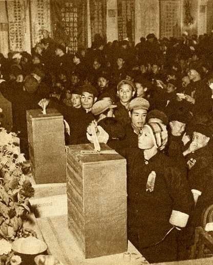 广西桂西僮族自治区首届各族人民代表会议于1952年12月6日在南宁市开幕。图为代表们投票选举自己的政府委员和主席。