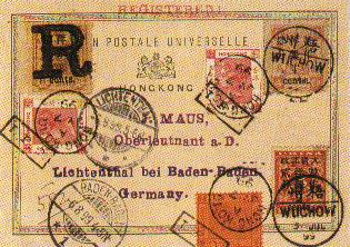 1899年梧州寄德国挂号明信片。盖戳梧州(1899年7月5日),盖戳香港(1899年7月7日),盖戳德国(1899年8月6日)。
