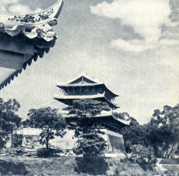 不用钉子的建筑。广西容县的真武阁是一座木结构建筑的,三层楼没有用一根钉子,只用20根木柱来支撑。据史料记载,这座建筑已有1200多年的历史。(1959年)